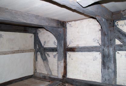 Die hellen Wandflächen zeigen fein ausgeführte Renaissancemalereien mit dunkel-grauen bis schwarzen Rahmungen der Gefache und zartem Blüten-/Blattwerk als Eckgestaltung. Das Fachwerk ist ebenfalls dunkelgrau gefasst.